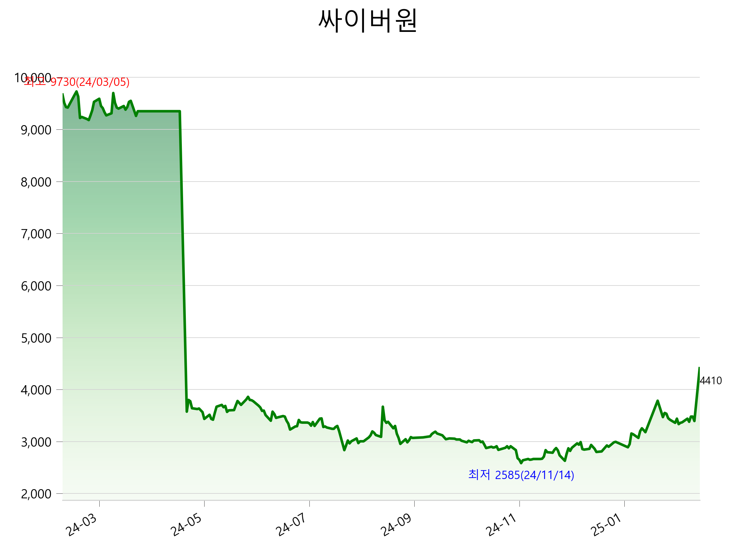 2월 24일 기준 주가는 4,410원 입니다. 아래는 최근 1년간의 주가흐름입니다.