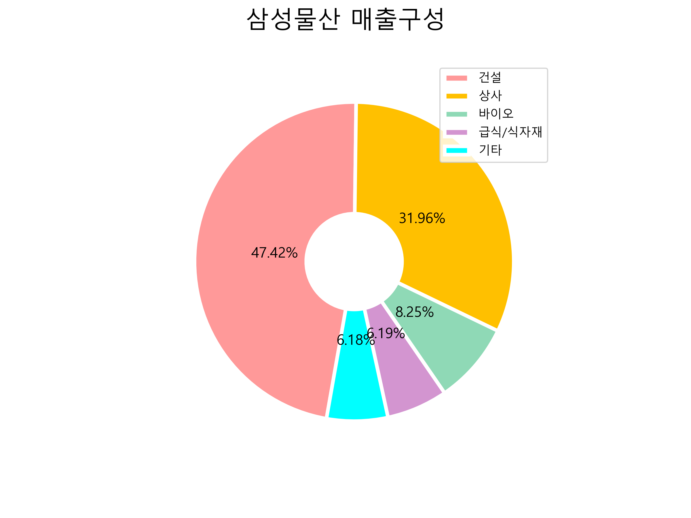 - 매출비중은 23년 3분기 기준 건설부문 46%, 상사부문 33%, 패션부문 4.7%, 리조트부문 1.8%, 급식/식자재유통 6.6%, 바이오부문 8.2%을 차지