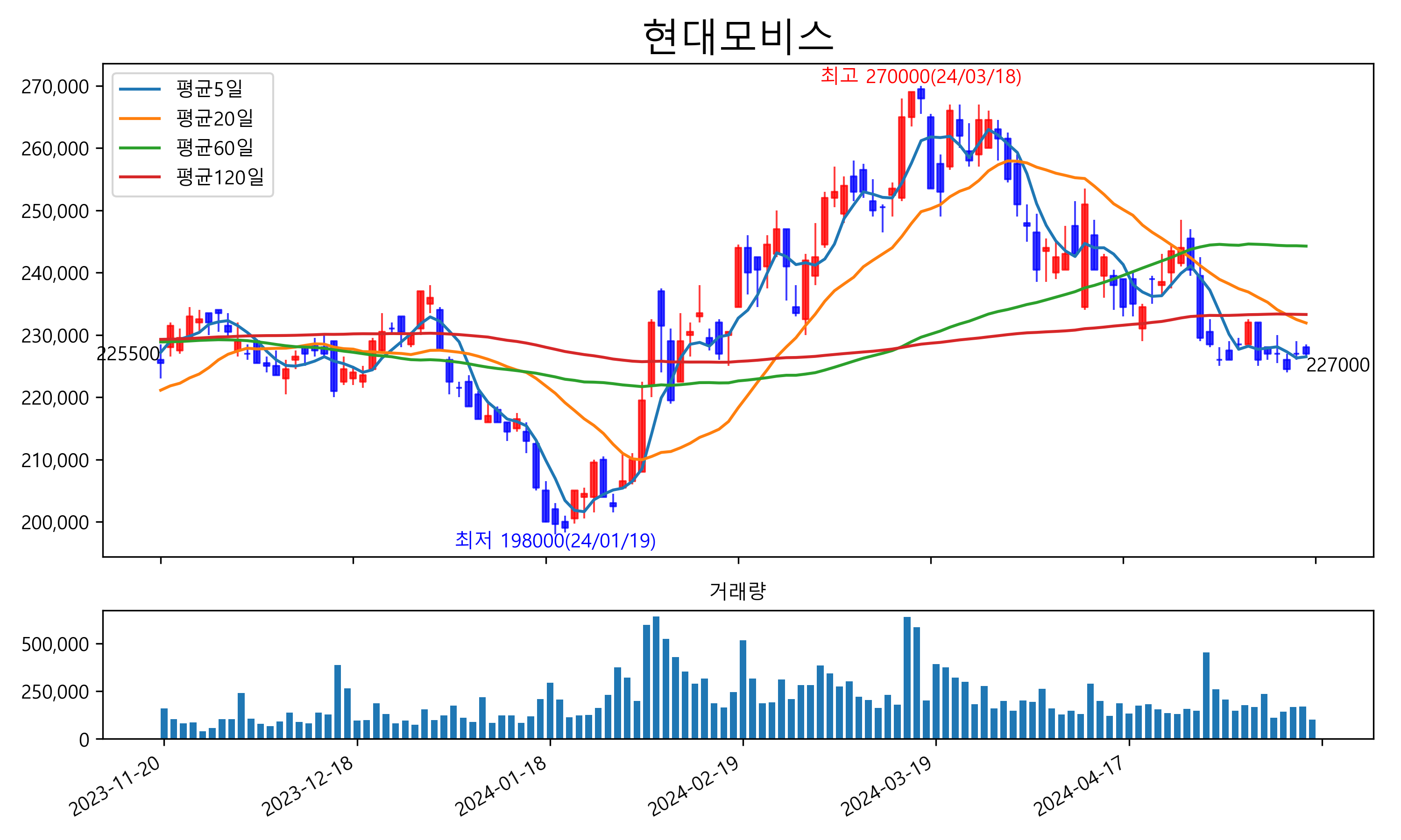 최근 6개월간 캔들차트 및 이동평균선입니다.