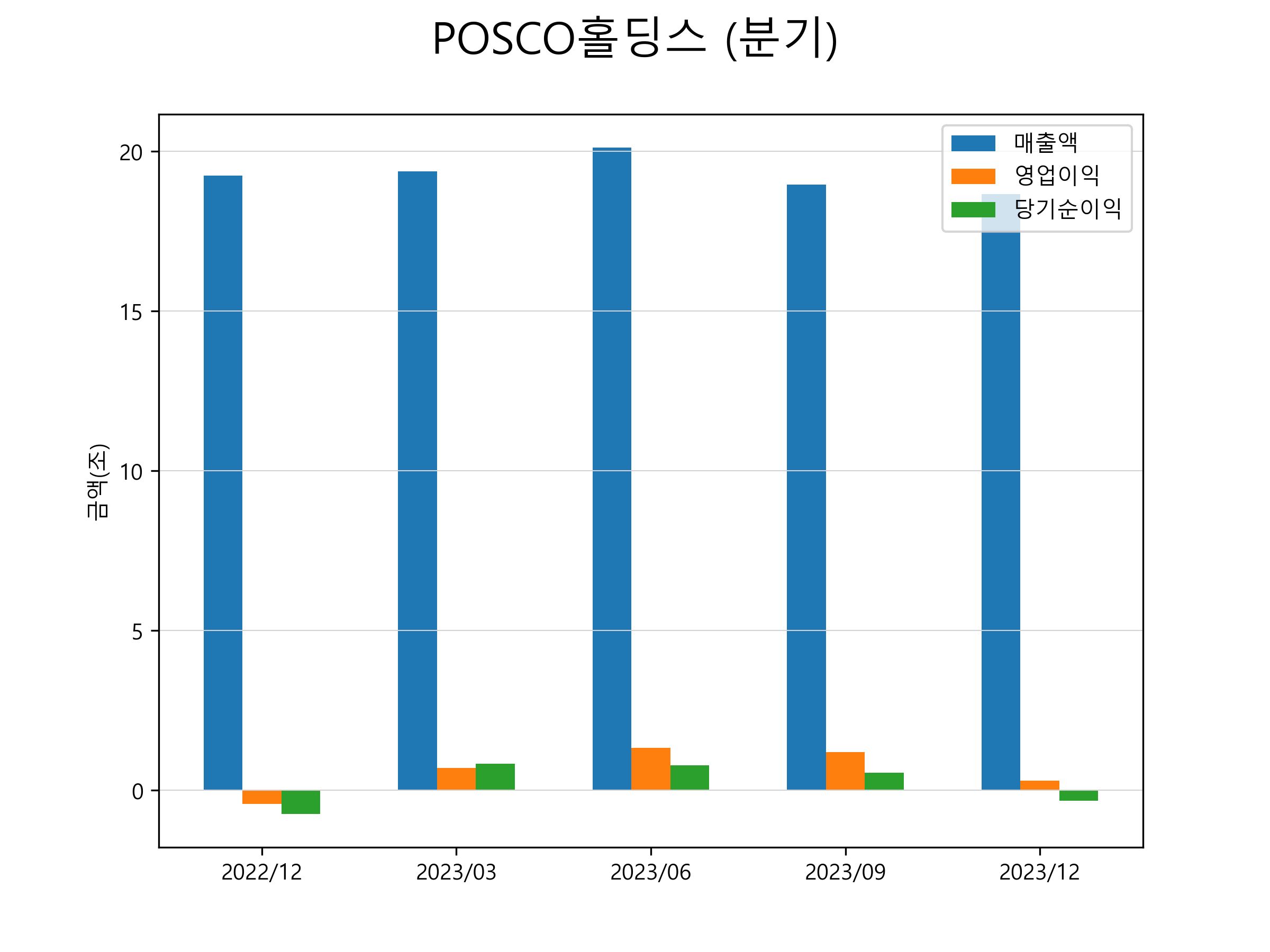 포스코홀딩스의 2023년 4분기 매출은 18조 6641억원, 영업이익 3043억원, 당기순손실 -3209억원을 기록했습니다. 분기별 매출 및 영업이익, 당기순이익 표입니다.