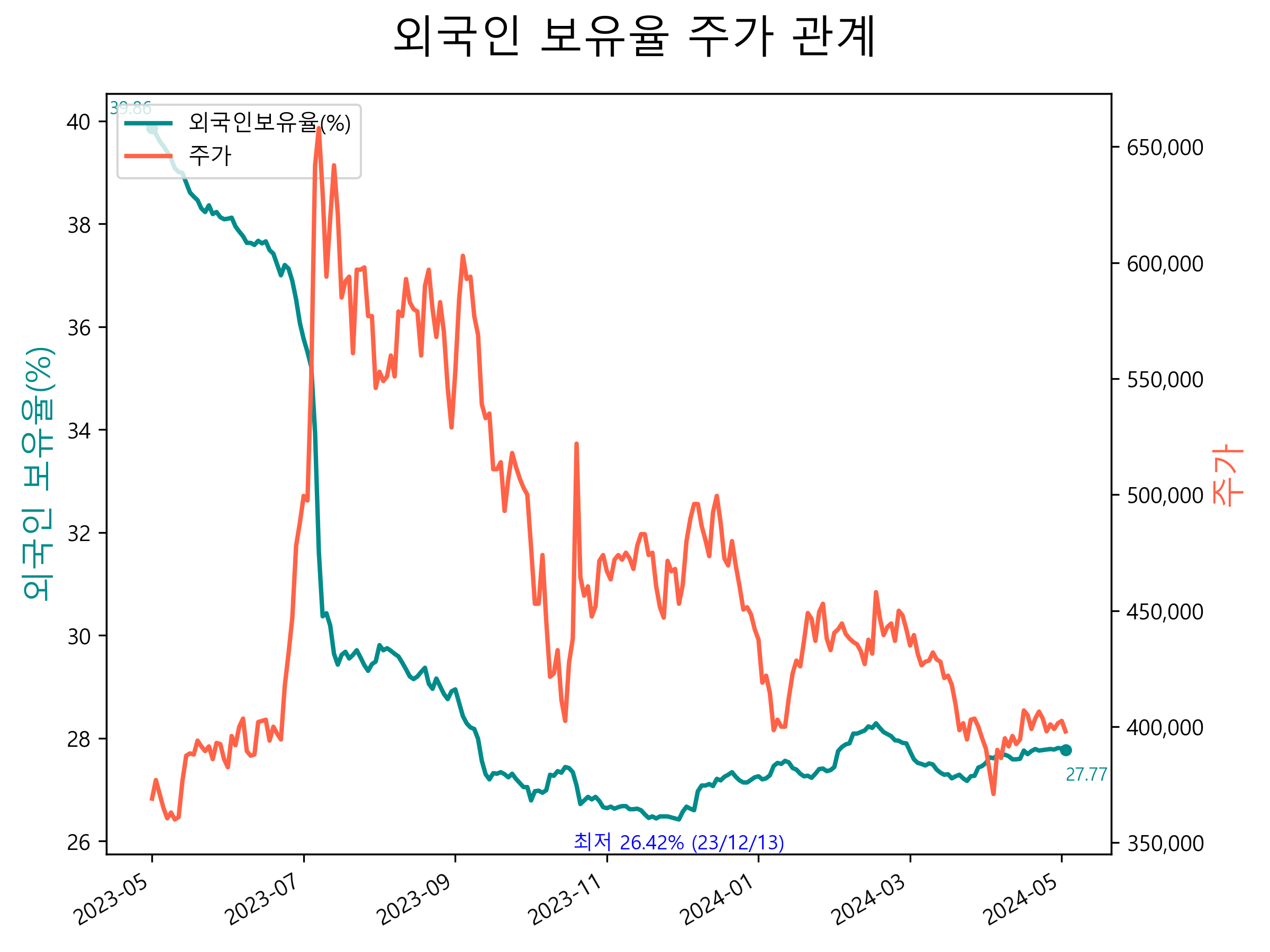 최근 1년간 외국인 보유율 및 주가와의 관계입니다.