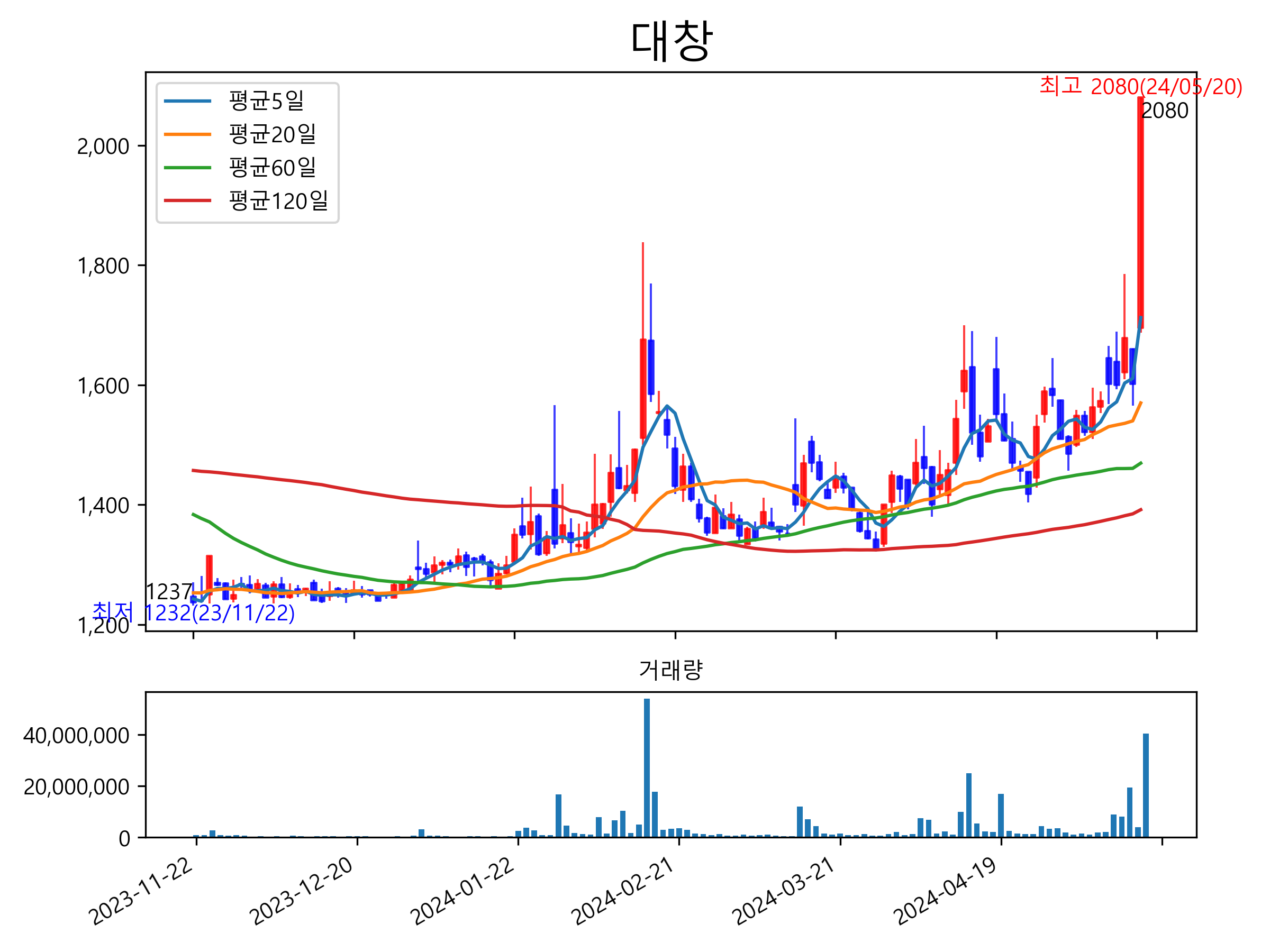 최근 6개월간 캔들차트 및 이동평균선입니다.