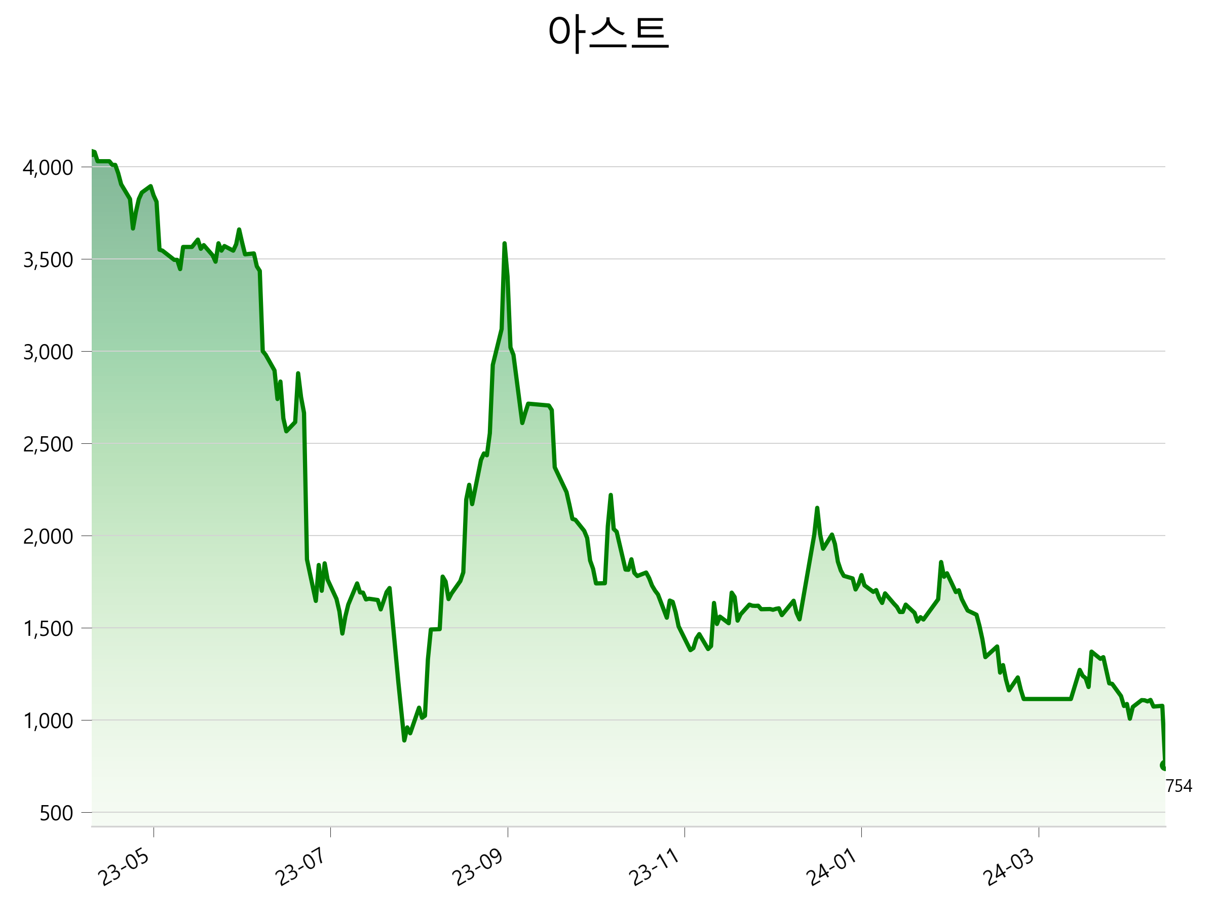 4월 30일 기준 주가는 754원 입니다. 아래는 최근 1년간의 주가흐름입니다.