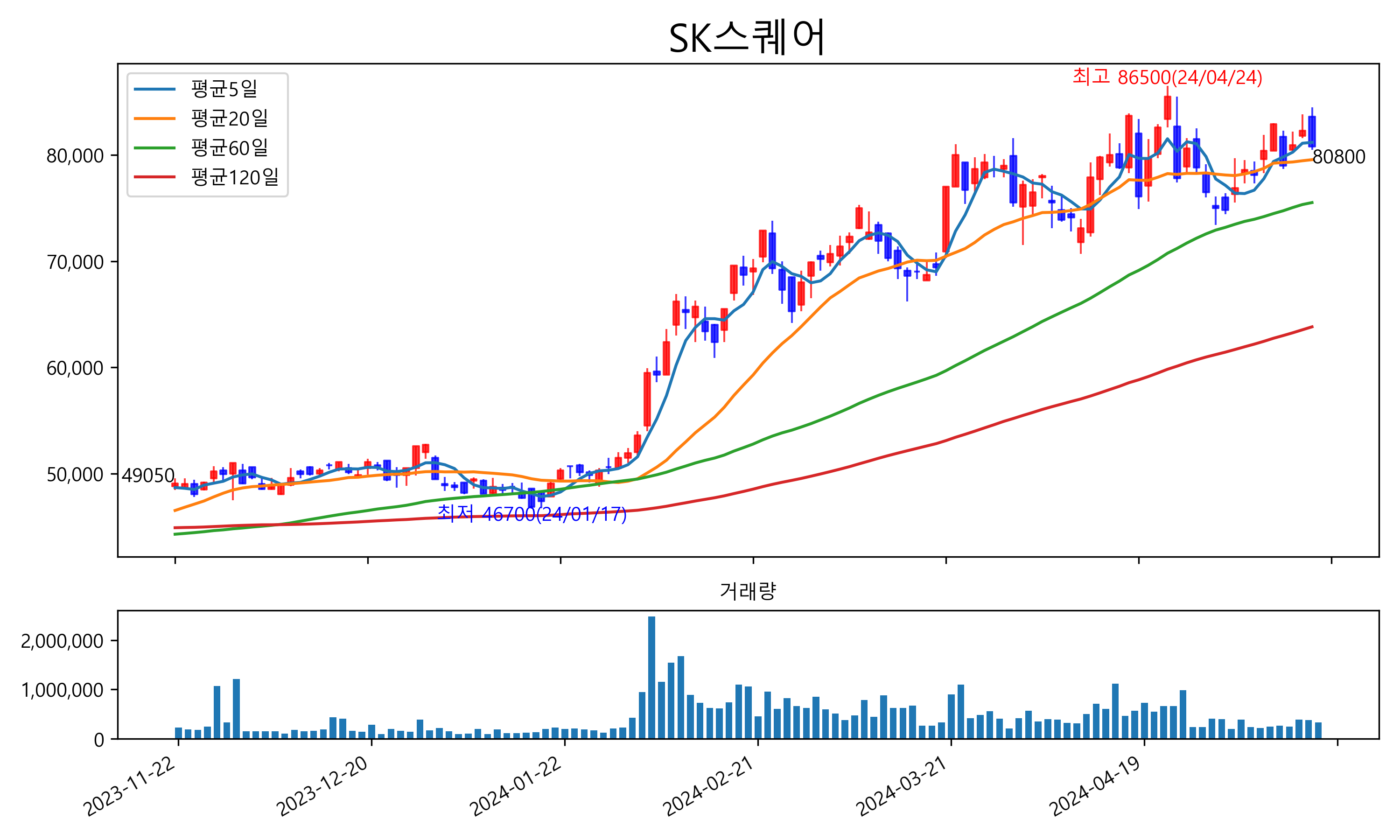 최근 6개월간 캔들차트 및 이동평균선입니다.