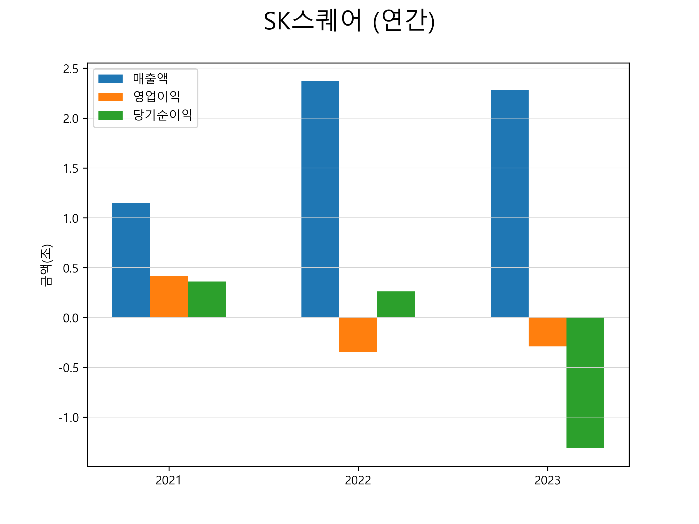 SK스퀘어의 최근 3년간 실적입니다. 2023년 매출은 2조 2765억원, 영업손실 -2871억원, 당기순손실 -1조 3148억원을 기록했습니다. 연간 매출 및 영업이익, 당기순이익 표입니다.