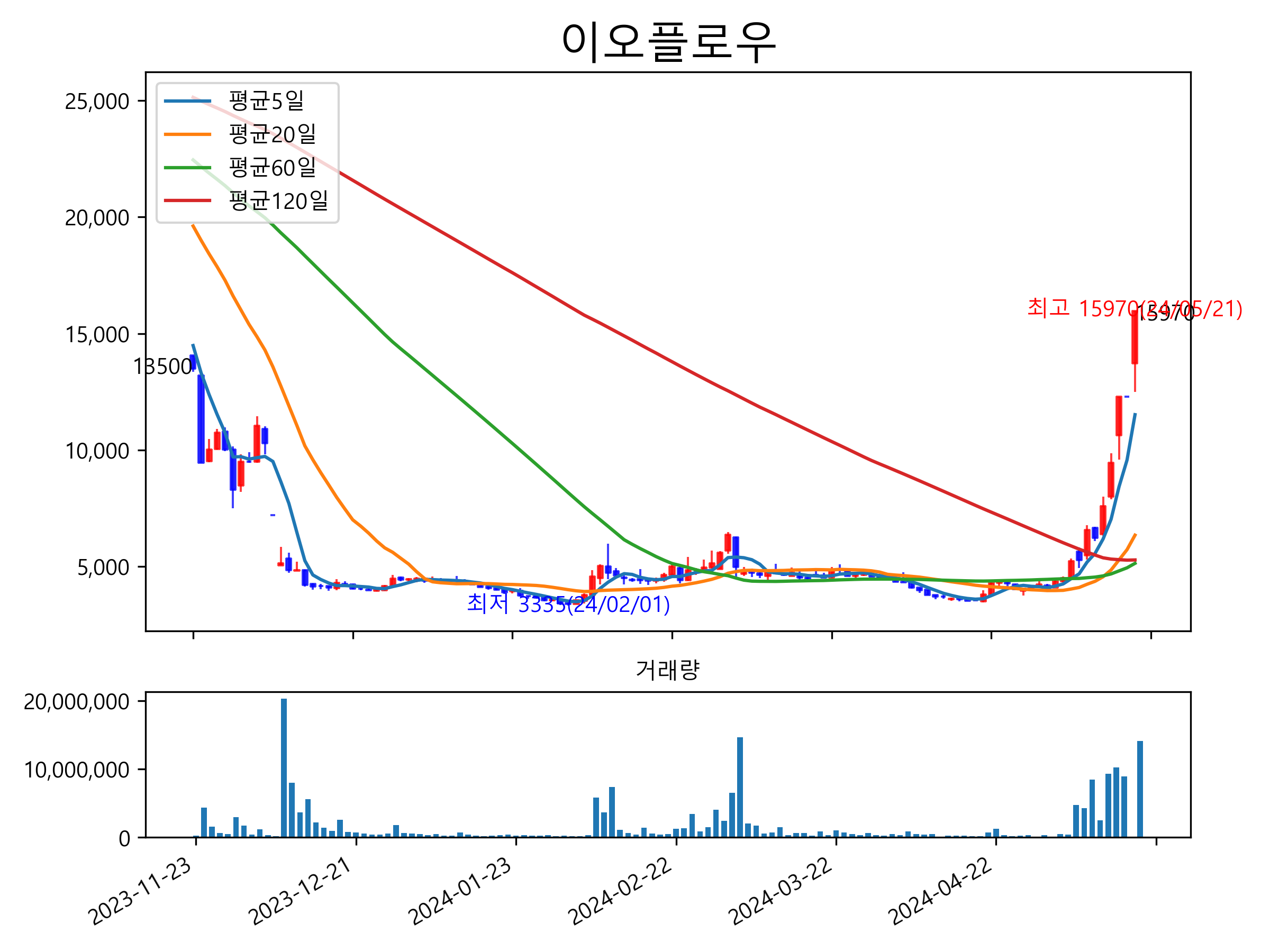 최근 6개월간 캔들차트 및 이동평균선입니다.